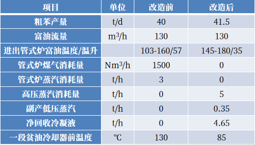 針對一、二期粗苯現場貧富油換熱效率低下、導致富油加熱器負荷過大的問題,我司建議新上一級貧富油換熱器,與原有貧富油換熱器串聯使用。采取該措施,首先可以提高富油進富油換熱器的溫度,降低蒸汽消耗,提高對貧油熱量的利用率;此外還能減小貧油冷卻器的熱負荷,減少冷卻水耗量。